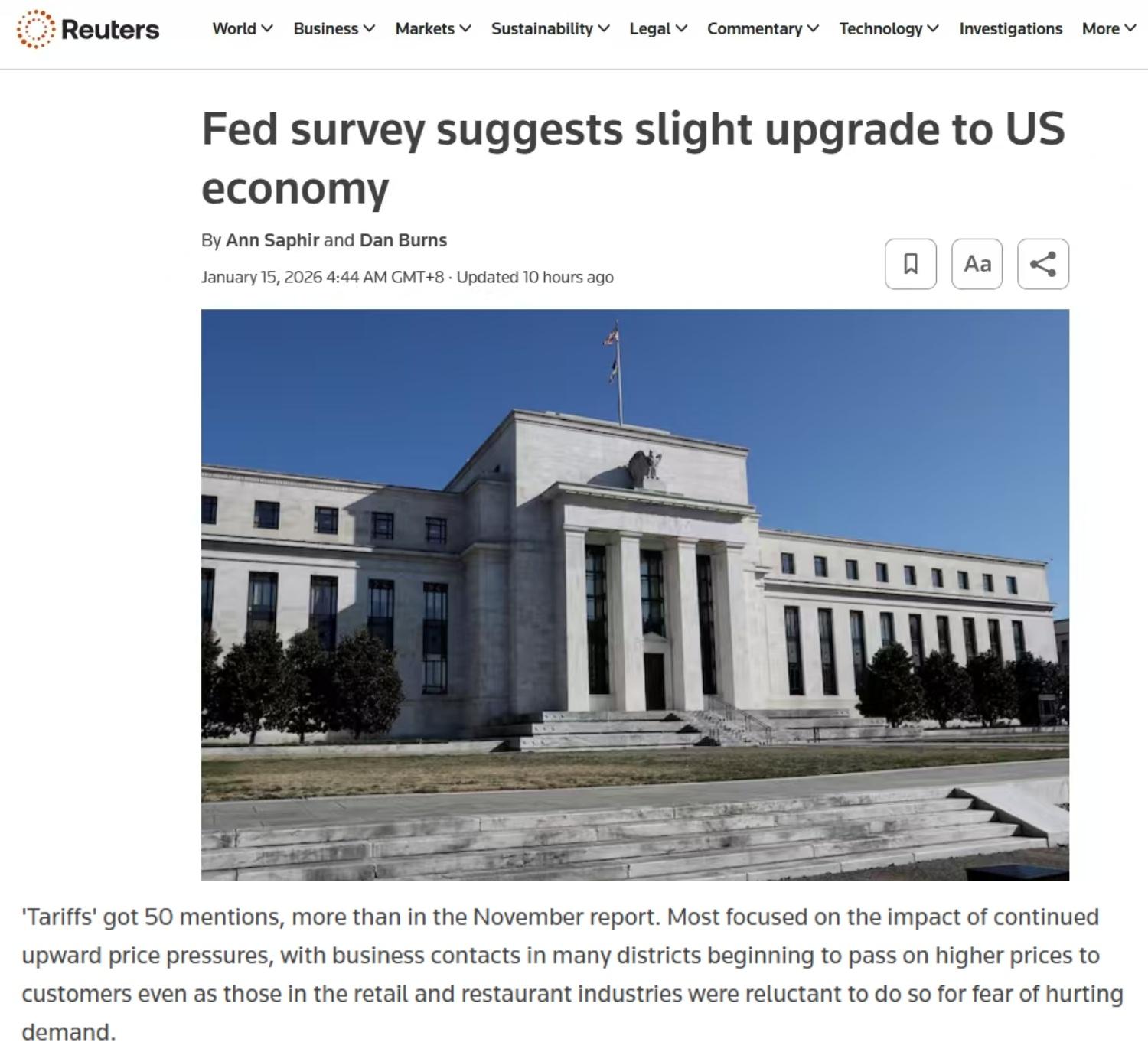 美国联邦储备委员会14日发布的全国经济形势调查报告显示,根据2025年11月中旬至2026年1月初收集的信息,多数联邦储备区经济活动改善,但关税带来的成本压力仍然持续。