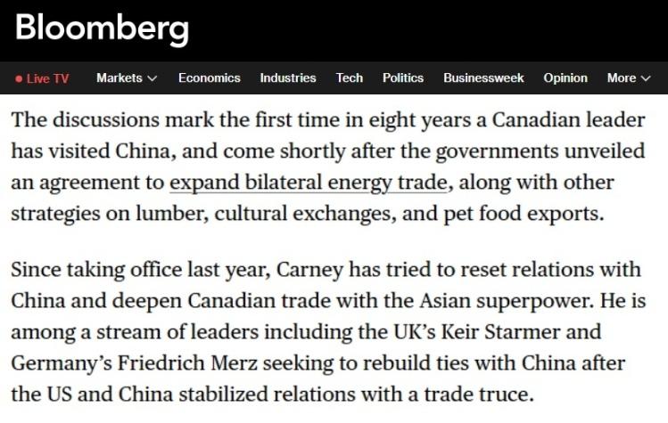 彭博社的报道指出,自去年上任以来,卡尼一直致力于重启对华关系,深化加拿大与这个亚洲超级大国的贸易往来。