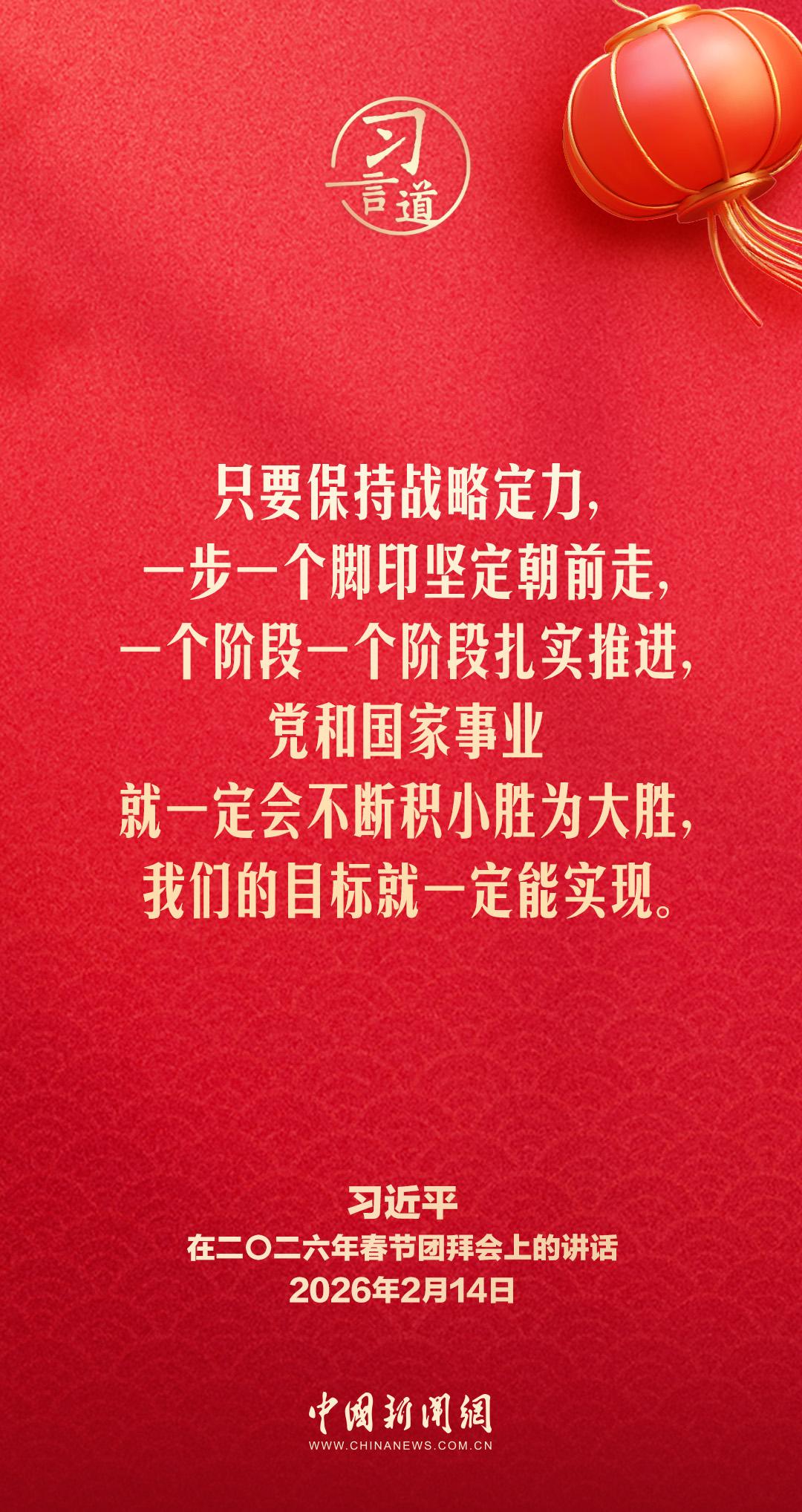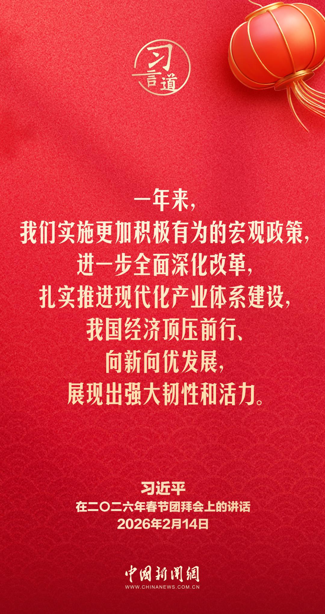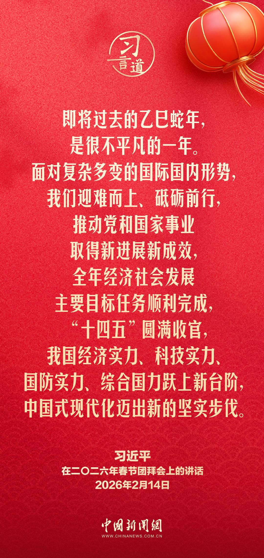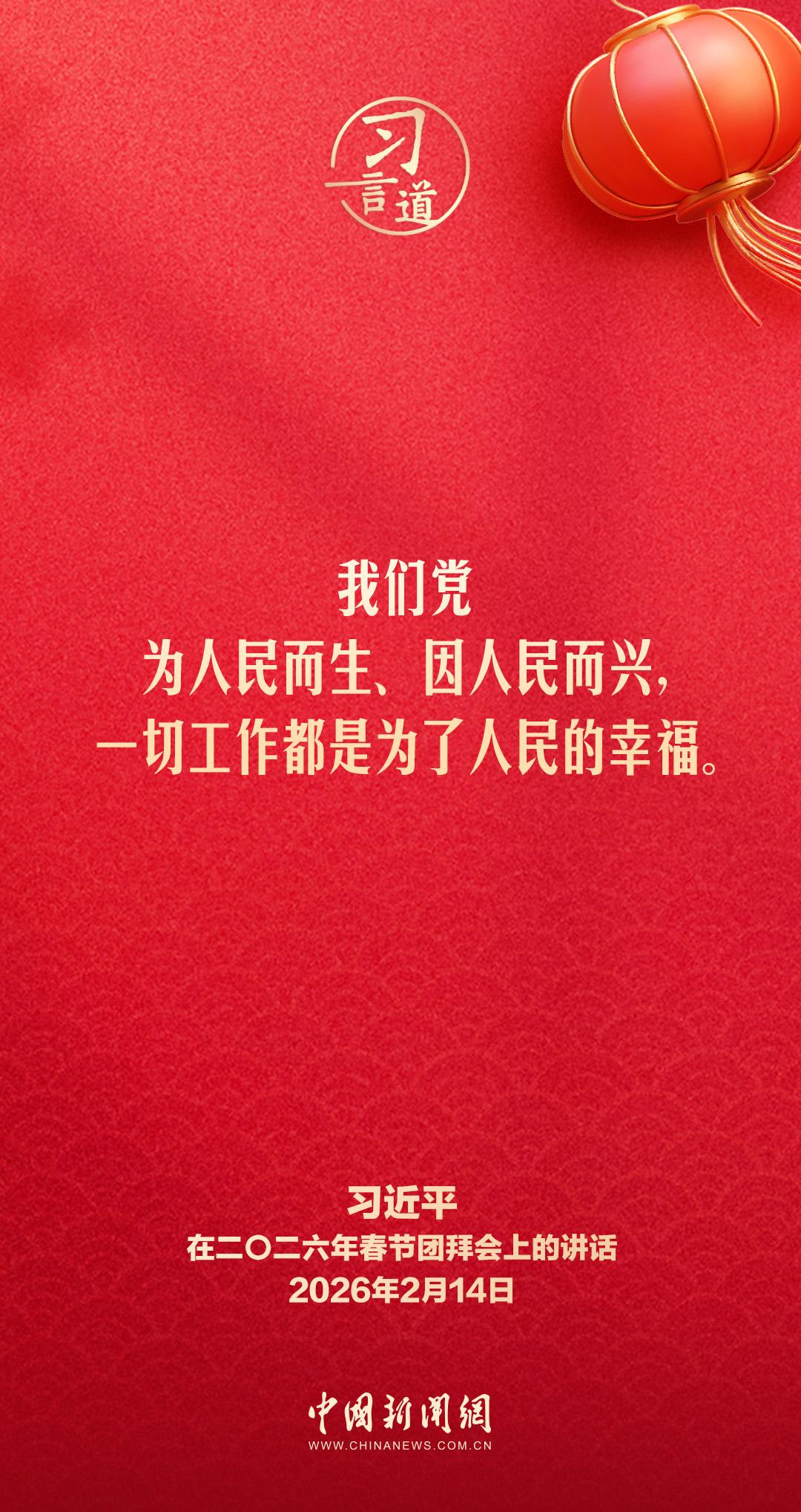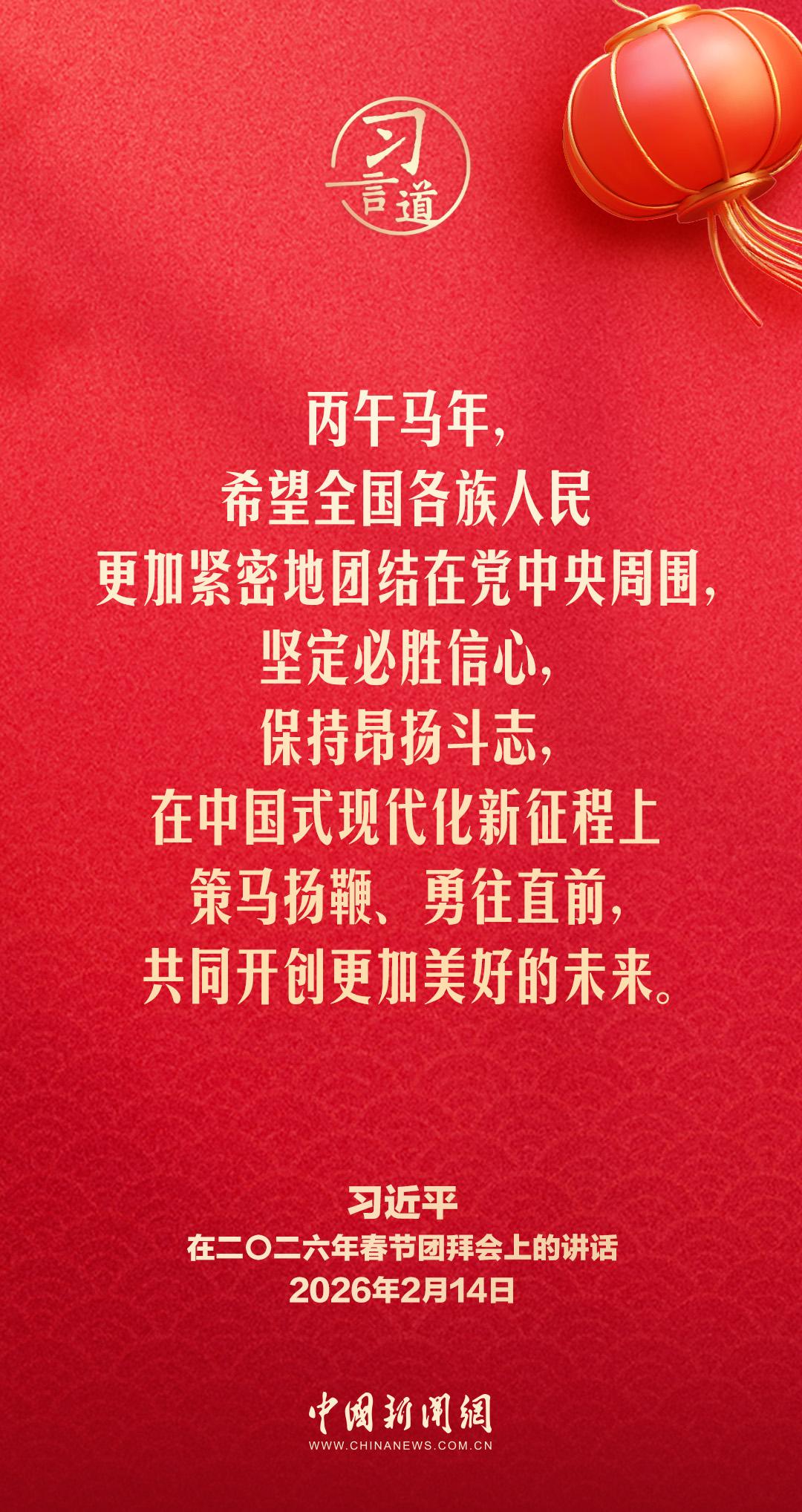 2月14日,中共中央、国务院在人民大会堂举行2026年春节团拜会。中共中央总书记、国家主席、中央军委主席365bet官网:发表讲话,代表党中央和国务院,向全国各族人民,向香港特别行政区同胞、澳门特别行政区同胞、台湾同胞和海外侨胞拜年。他指出——
