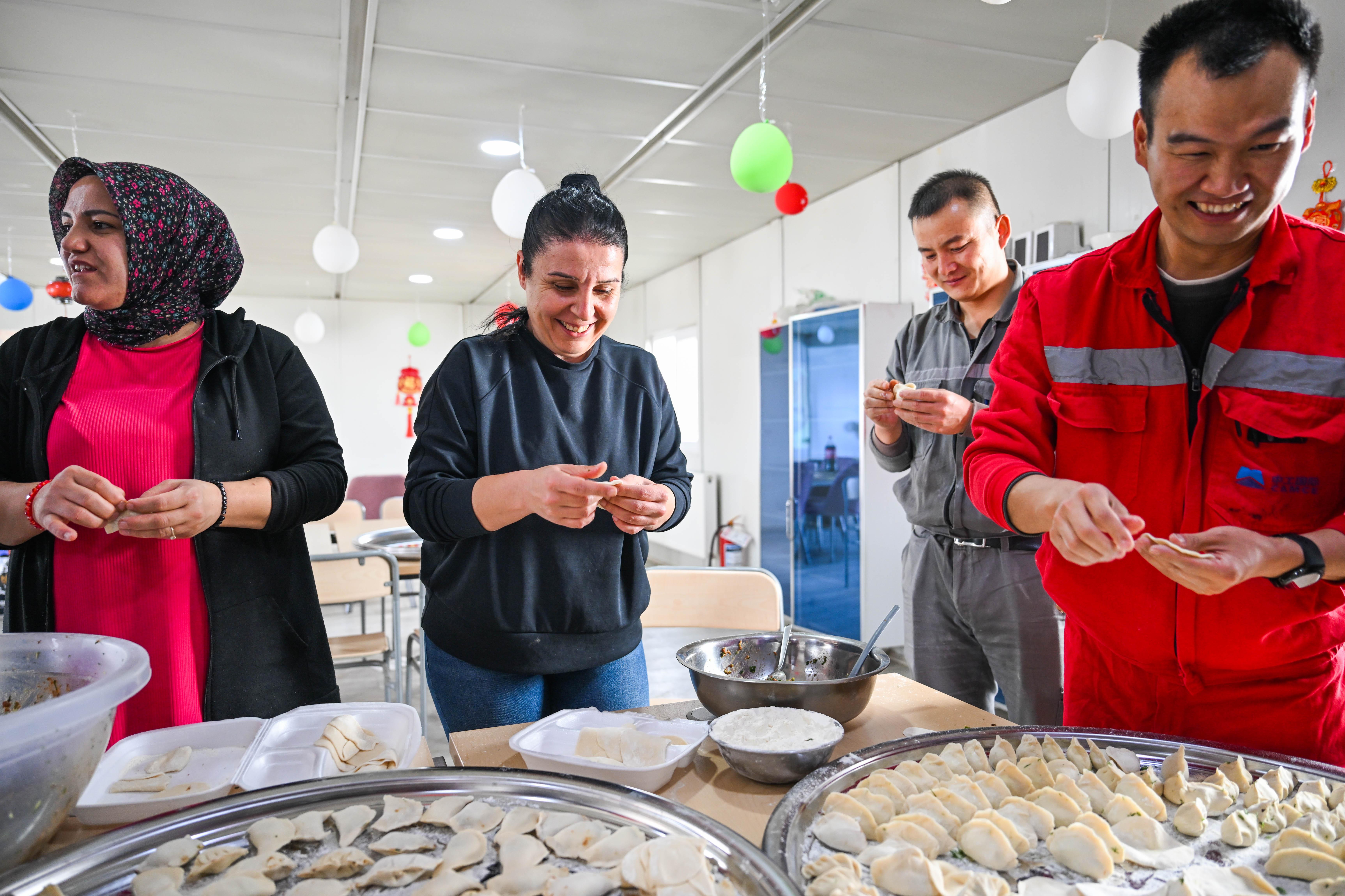 2月16日,在土耳其阿克萨拉伊省图兹湖地下天然气储库扩建项目二期工程营地,中土两国职工在一起包饺子。新华社记者刘磊摄