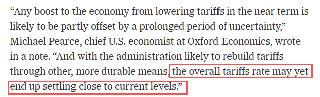 牛津经济研究院美国首席经济学家迈克尔·皮尔斯指出:“短期降关税对经济的提振,很可能被长期不确定性部分抵消。鉴于政府可能通过更持久的手段重建关税,整体税率最终或与当前水平相差无几。”