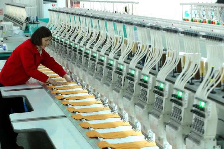 2月22日,山东省青岛市即墨区即发集团有限公司的工人在绣花生产线上忙碌。新华社发(梁孝鹏 摄)