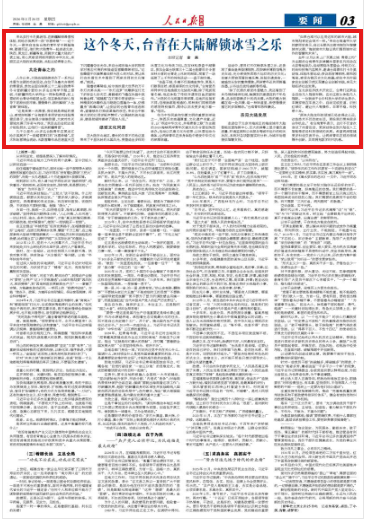 去年12月以来,以“双奥之城 青春之约”为主题的台湾青年京津冀冰雪季系列活动在北京等地举办。活动围绕冰雪盛会、传统文化、时尚科技等内容展开,邀请台湾青年打卡冬奥场馆,体验冰雪运动;参访故宫博物院、颐和园等地,感受古都历史文化底蕴;前往中关村国家自主创新示范区观摩企业创新实践,亲见大陆经济社会发展。