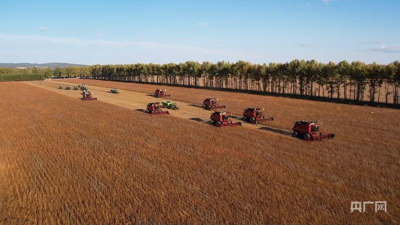 在鹤岗市萝北县,大马力机车正在收获大豆(央广网发 李晟 摄)