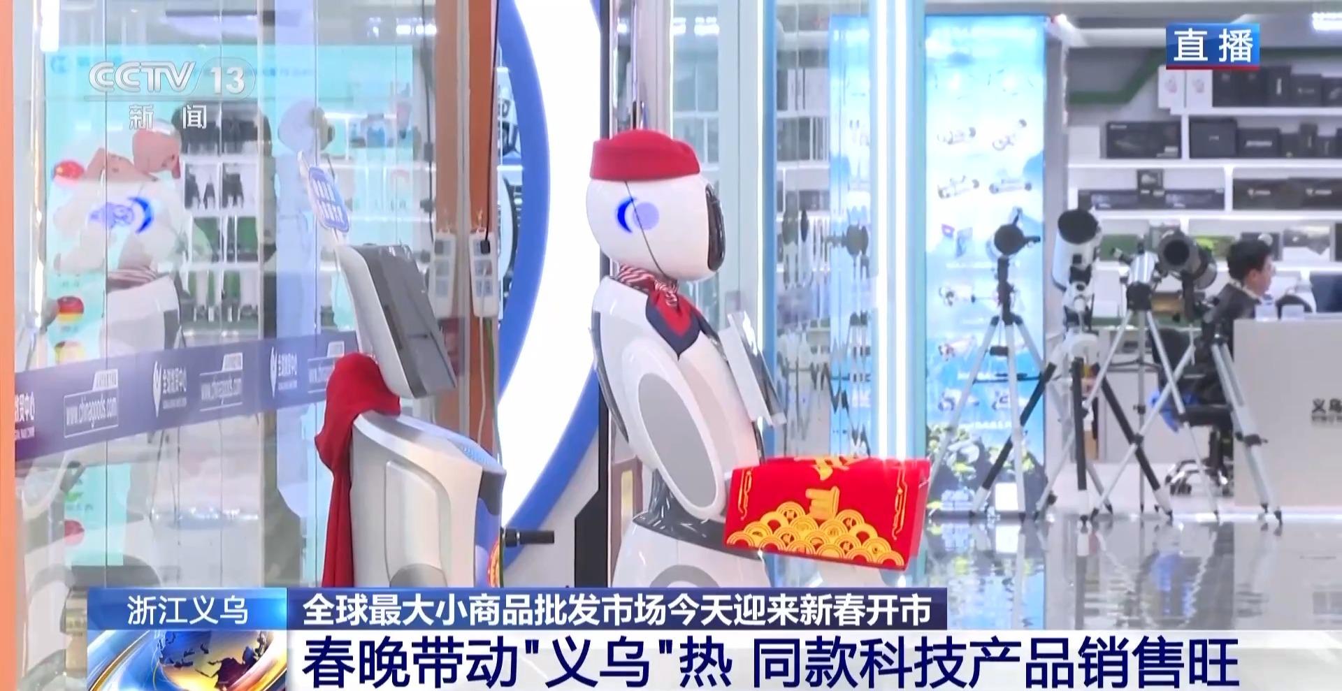 在市场,今年采购商线上线下的“购物车”里,装的东西也跟往年不太一样。春晚舞台上表演武术的机器人如今这里也有了同款!没想到吧,在义乌小商品市场里,竟然也有授权销售商店。今天开市,商户现场展示起来,既满足观众的好奇心,也助力招揽生意。除了机器人,还有无人机、AI眼镜这些高科技产品,都成了国内外客商争相下单的香饽饽。