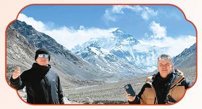 法国游客古特和格兰杰在西藏自治区的珠峰大本营。成都极自游国际旅行社供图