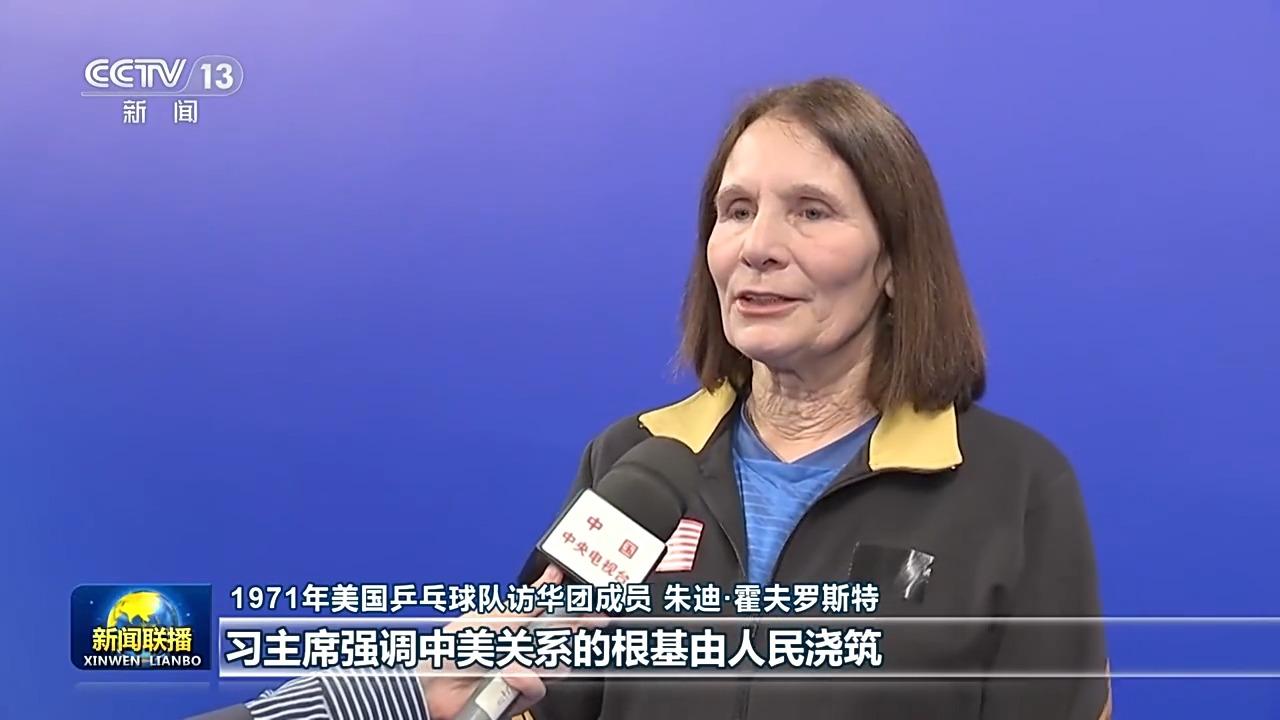 1971年美国乒乓球队访华团成员 朱迪·霍夫罗斯特:习主席强调中美关系的根基由人民浇筑,这一点我深有感触。在当下,相互理解与对话比任何时候都更加重要,我也希望我们能将“乒乓外交”精神继续传承,在两国人民间传递温情,增进理解。