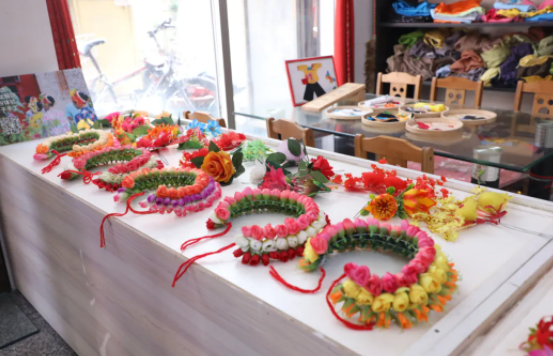 蟳埔女头饰是传统服饰中的一大特色,叫“簪花围”,是将秀发盘于脑后,系上红头绳,梳成圆髻,然后再穿上一支“骨髻”,另用鲜花的花苞或花蕾串成花环,以发髻为圆心,圈戴在脑后。“头饰常用的素馨花、含笑花、粗糠花等,据传是从西域移植而来。” 蟳埔媳妇蒋玲玲说道,头饰不仅漂亮,而且体现了中西文化的融合。