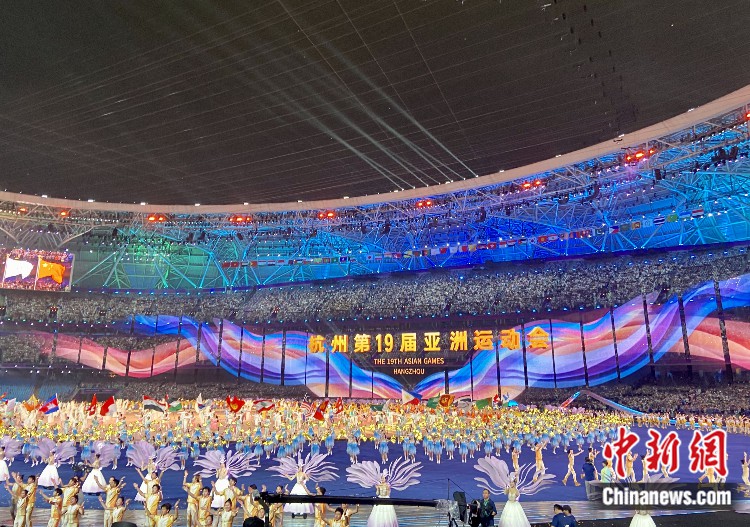 中新社杭州9月24日电 (方堃 项菁)看得见数字烟花、听得见钱江潮水、闻得到桂花香气……23日晚,钱塘江两岸灯光照耀古今,杭州第19届亚运会开幕式多项环节“刷新”亚运史。