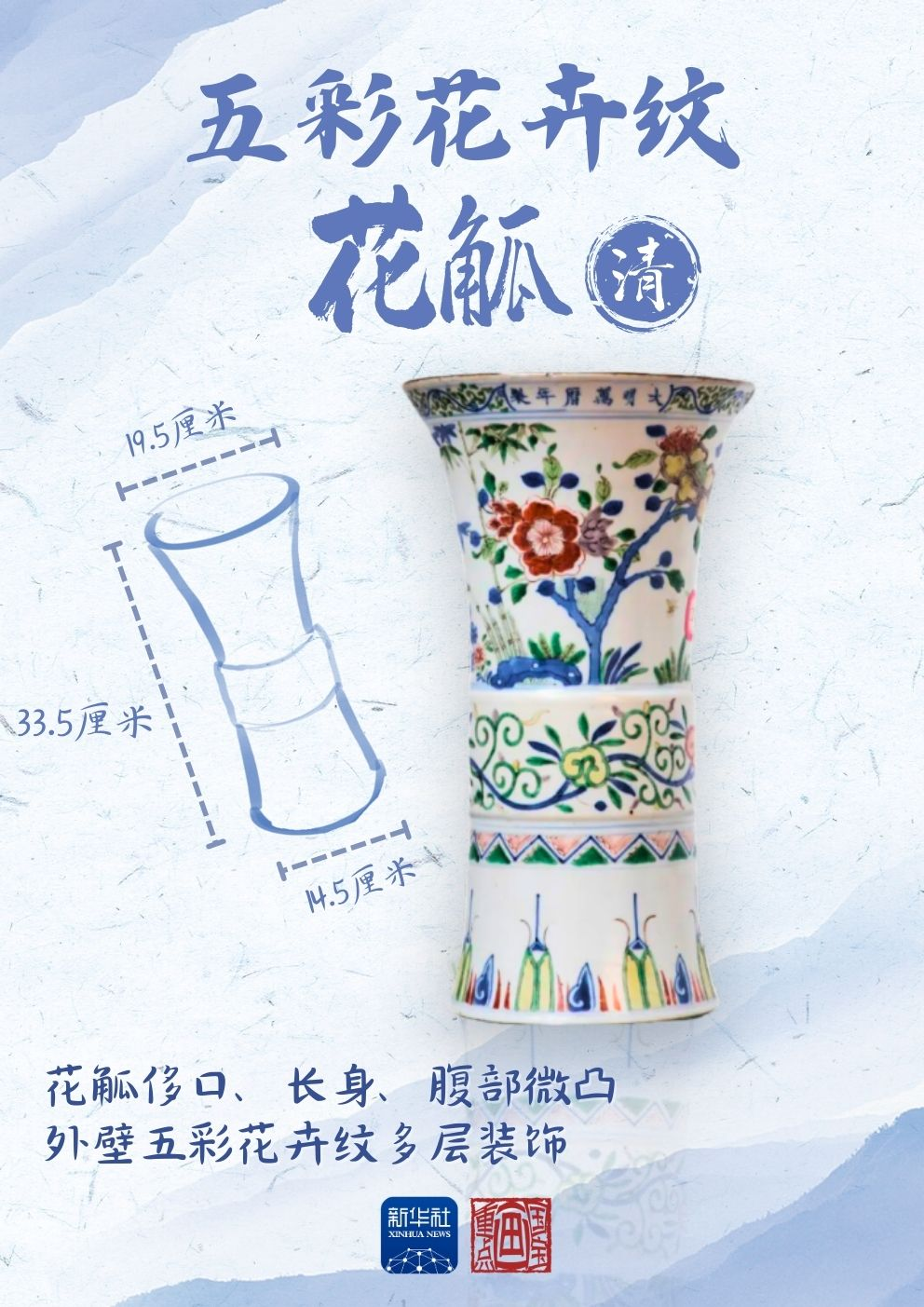 这件清代的五彩花卉纹花觚 外壁用五彩花卉纹多层装饰 花枝伸展,鲜艳欲滴 体现出五彩斑斓的春色