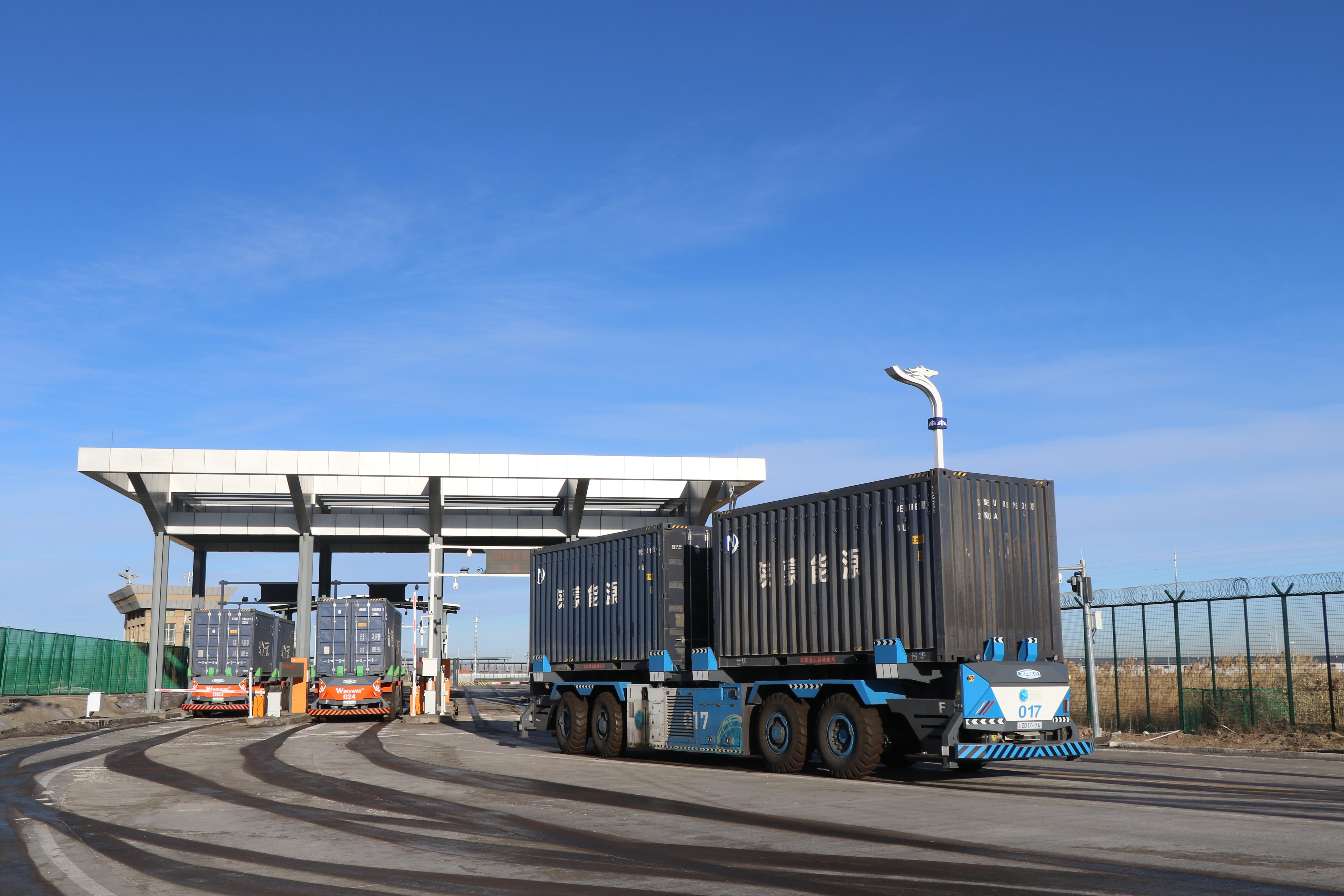 AGV车辆从蒙古国数字化集装箱码头吊装重箱后,由地下埋设的磁钉导引,沿着编写好的路径自动行驶,经甘其毛都口岸入境,直通专用海关监管作业场所落重,然后吊装空箱,离岸出境,交互往返。