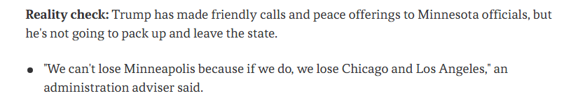 报道还分析认为,总体来看,特朗普希望联邦移民执法人员从明尼苏达州撤离的过程中做到“体面和平”,并且他不想让撤离看起来像移民政策失败或政府支持率的大幅下降所致。但事实上,特朗普不会真的放弃并离开这个州。一位美国政府顾问就表示:“我们不能失去明尼阿波利斯,因为一旦失去它,我们也就失去了芝加哥和洛杉矶。”
