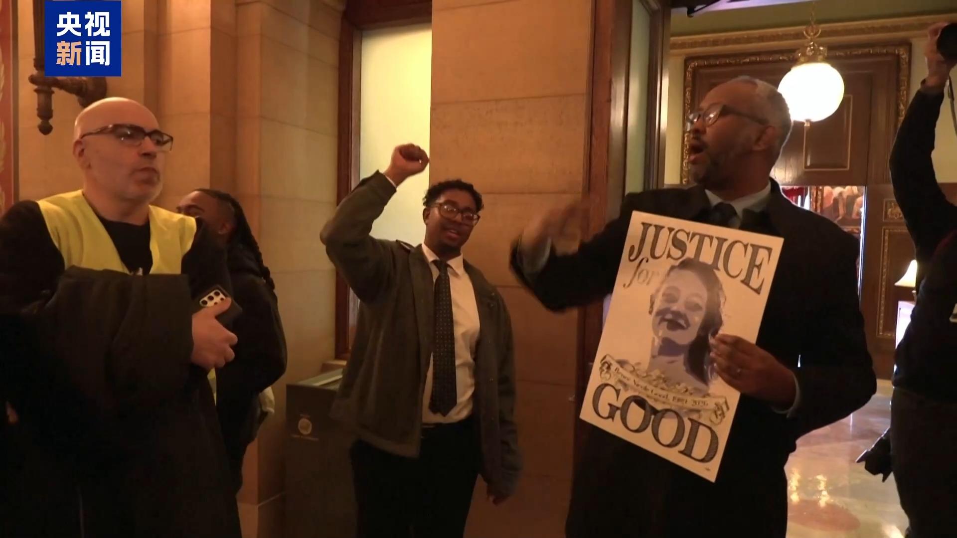 27日,多名抗议者在明尼苏达州议会大楼内进行示威活动,抗议联邦移民执法人员暴力执法行为。