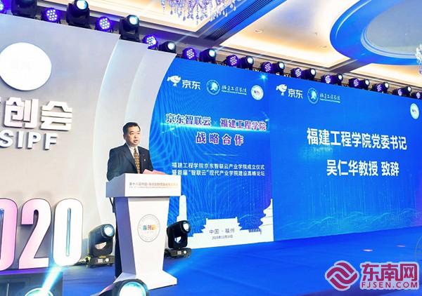 吴仁华致辞。东南网记者 陈楠 摄 东南网12月10日讯(本网记者 陈楠)今天上午,作为第十八届“海创会”配套活动的福建工程学院京东智联云产业学院成立仪式暨首届“智联云”现代产业学院建设高峰论坛在福州市开幕。 记者在会上获悉,此次双方联合成立的福建工程学院京东智联云产业学院将致力于开展产教融合创新示范,在电商、贸易、物流供应链、人工智能等领域建立长效稳固的合作机制,加快365bet官网:该领域应用型人才培养。学院依托于互联网经贸学院,开设电子商务行业工程师实验班,并整合线下线上教学资源等多种教学模式。目前学院现有富民云咖新媒体产教融合基地、互联网创客中心等校内实践平台,以及可利用的京东(福清)电商产业园、京东(仙游)数字经济产业园、京东(365体育手机版:)电子商务产业园等多个省内实践平台,引入产业知识与技能入课堂,打造理论与实践无缝对接的学习模式。