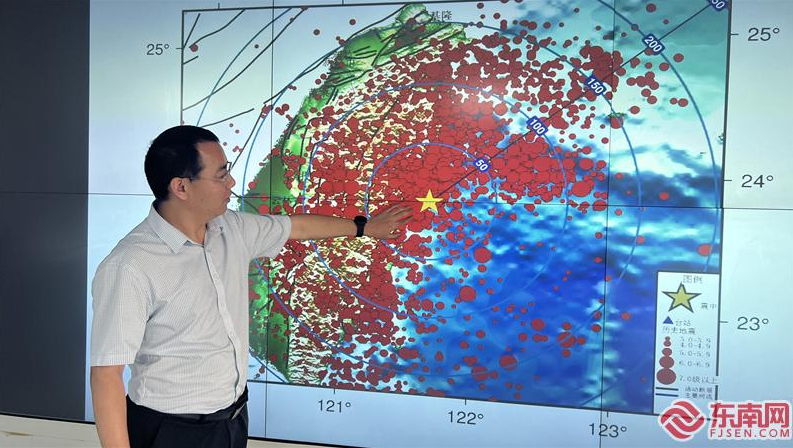 李军介绍,星形为此次花莲地震震中,红点为台湾地区历史地震震中。 据统计,此次地震的震中50公里范围内,自1970年以来发生了35次6级以上地震、3次7级以上地震。 “在这个区域发生一次7级地震,是比较正常的现象。”李军说。 全省已部署1100多个监测站点和18000多个预警终端 地震发生后,为何福建人能够收到地震波即将抵达的预警?据介绍,福建地震台通过在全省部署的1100多个地震监测站点,及时监测地震信息,并研发了地震预警系统。地震发生后的20秒内,通过官方网站、“福建地震预警”APP及时发布,此外省内遍布政府机关、地铁站点、中小学校等地的18000多台地震预警终端也将发出警报。 简而言之,每当台湾发生显著地震后、地震波抵达福建前,福建地震台就能够将预警发布给公众。“这中间大约有30-40秒,公众可以抓紧时间做好防范。”李军说。 地震来临时,公众首先需要保持镇定,采取就地避险措施。“这样的地震并不会对福建造成明显伤害,只是震感比较强烈。”李军建议,市民可以靠着坚固墙角或躲在坚硬的桌子下方,等待地震结束后再恢复正常活动。